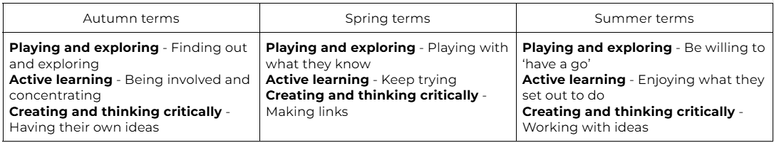 The Characteristics of Effective Teaching and Learning describe how children learn, rather than just what they learn. While we recognise that all children develop at different rates, we focus on three key characteristics of effective teaching and learning every long term.